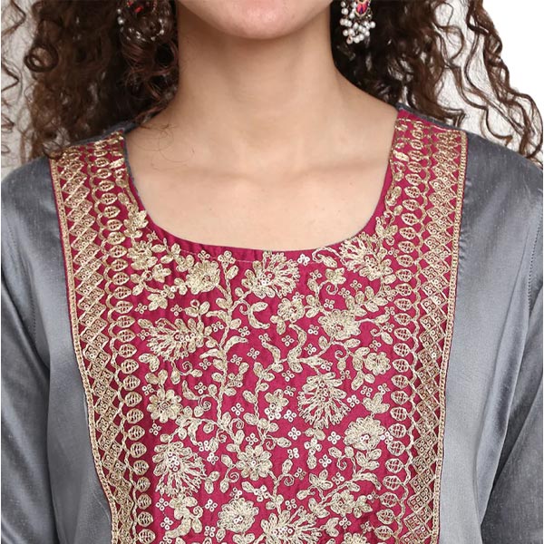 customize your wardrobe with this refreshing styles, like this grey, knee-length women's kurta. this is made in poly silk fabric and highlighted with a round neck and three-fourth sleeves. team it with any palazzos, secret pants or leggings of your choice.