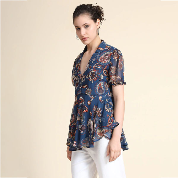 Women Teal Chiffon Paisley Flared Top